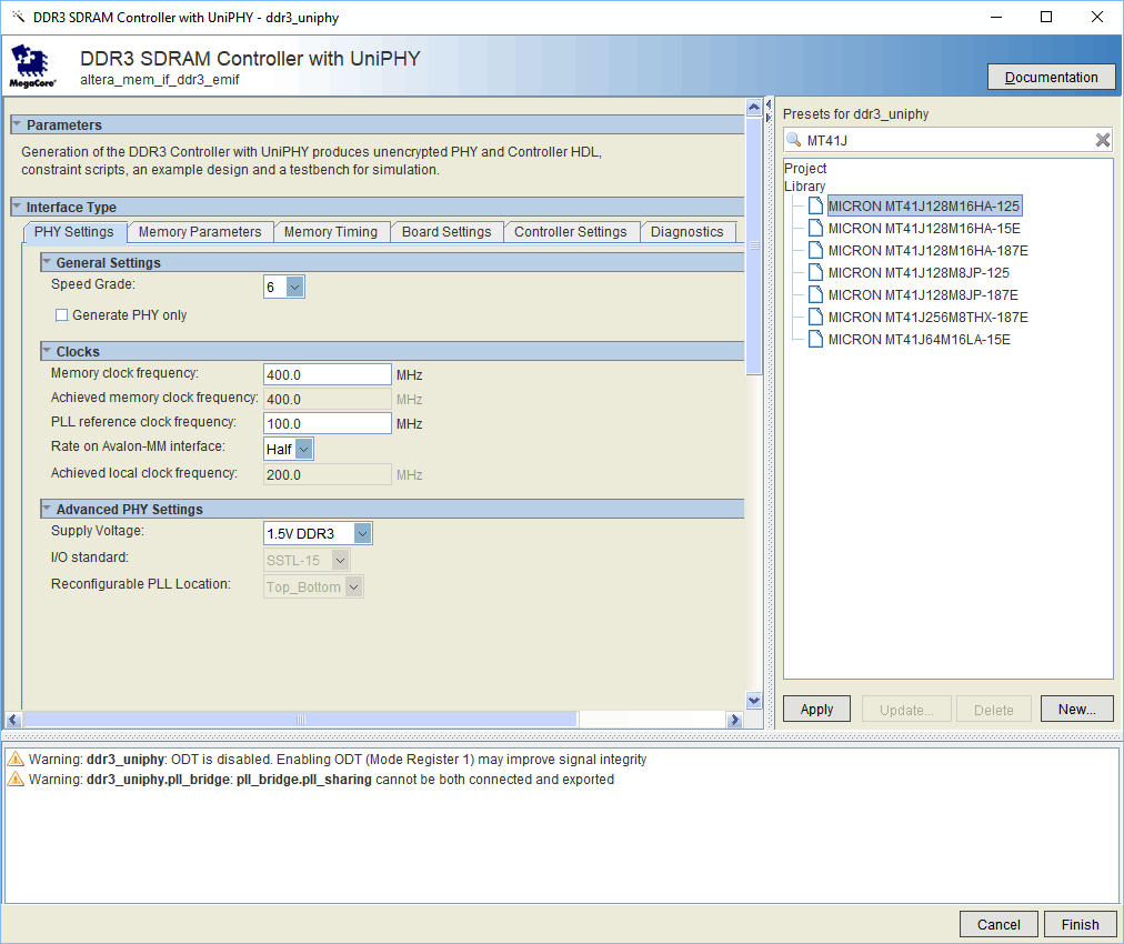 Double-click on “DDR3 SDRAM Controller with UniPHY” IP Core from IP Catalog (View -> Utility Windows -> IP Catalog), “Save IP Variation” window will open. Enter the IP Variation file name and click “OK”. The “DDR3 SDRAM Controller with UniPHY” configuration window will open. Change the “PHY Settings” as shown below